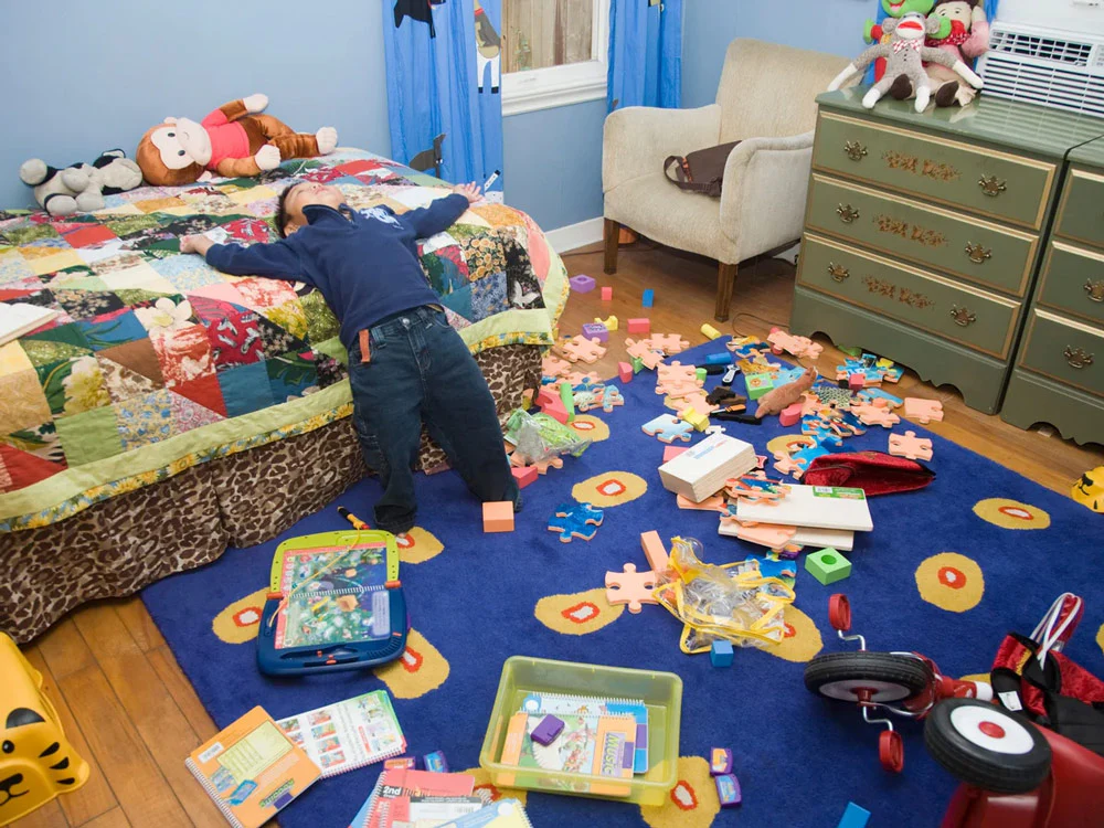 Cluttered playroom with too many toys causing distraction